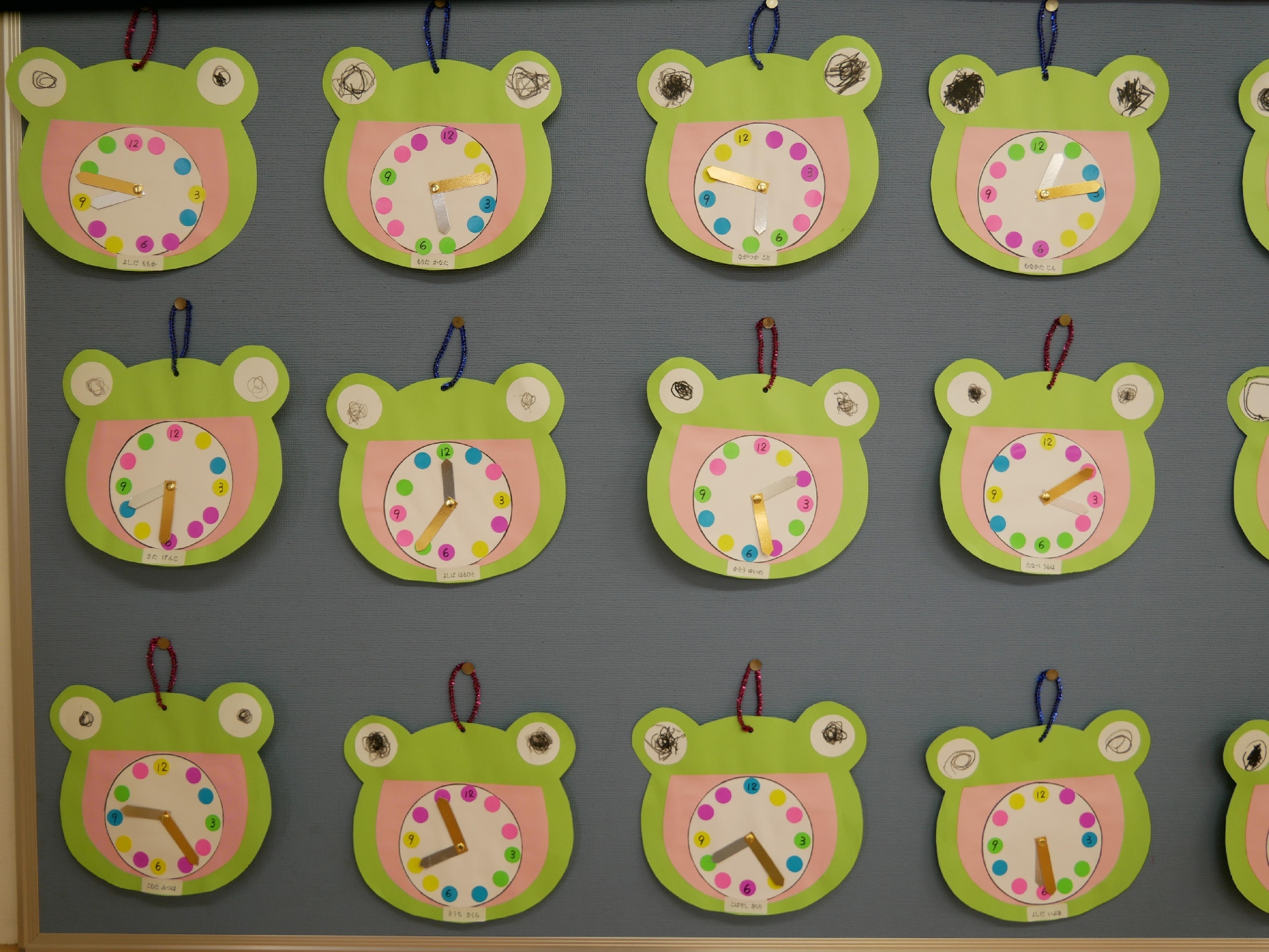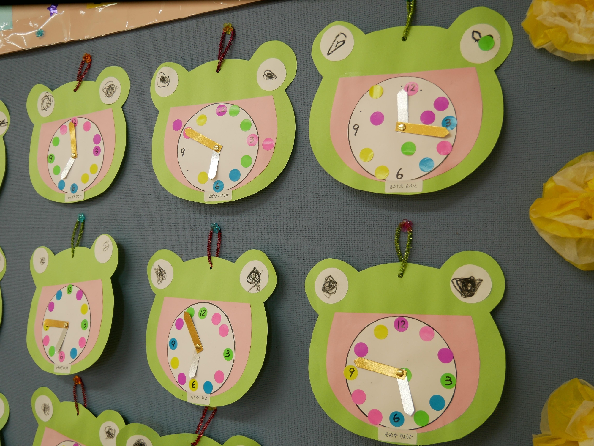 保育参観でお家の人と一緒にカエルの時計を作りました。