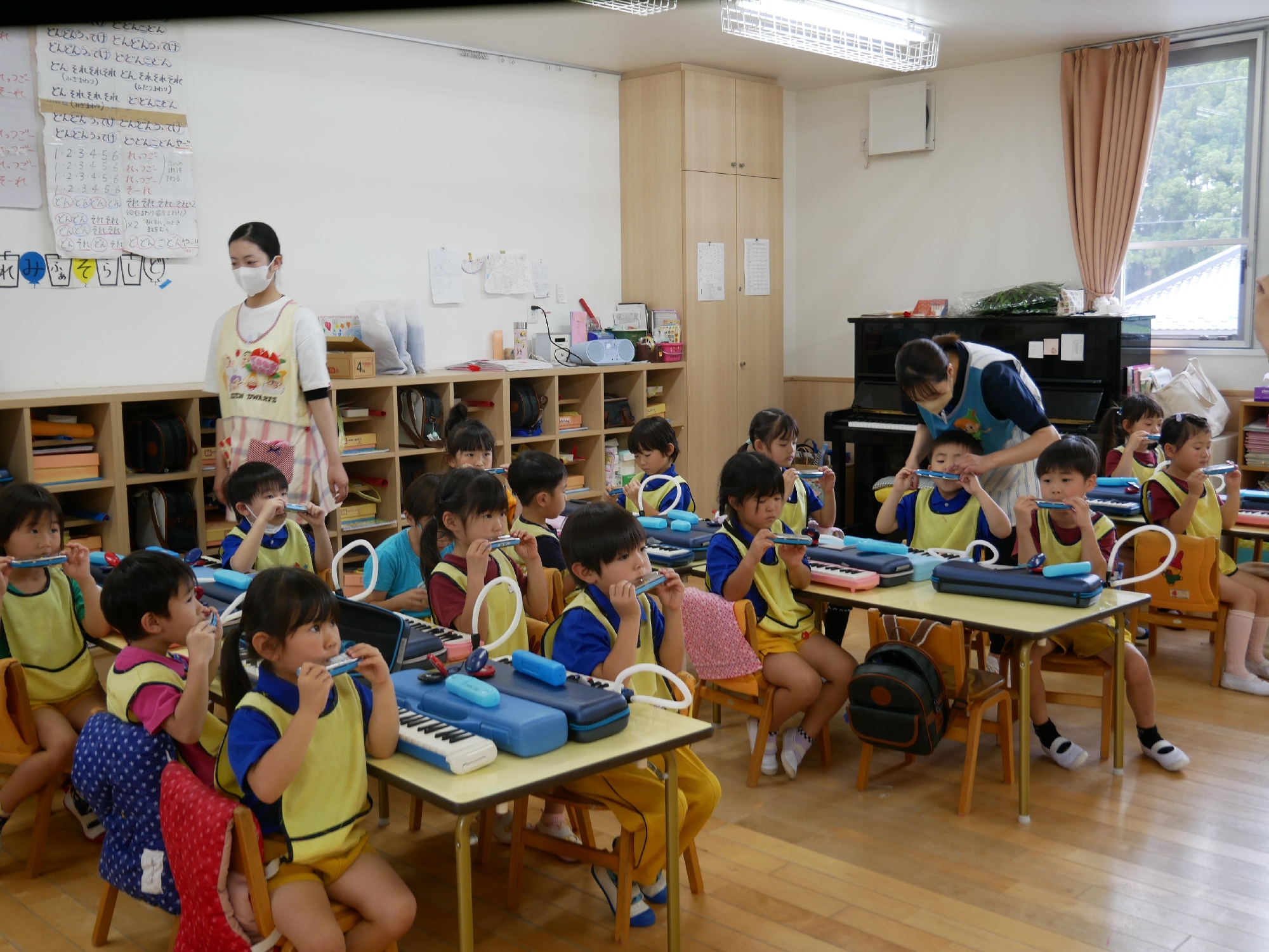 松坂先生やクラス担任の先生、実習生と一緒に、ピアニカやハーモニカをやりました。