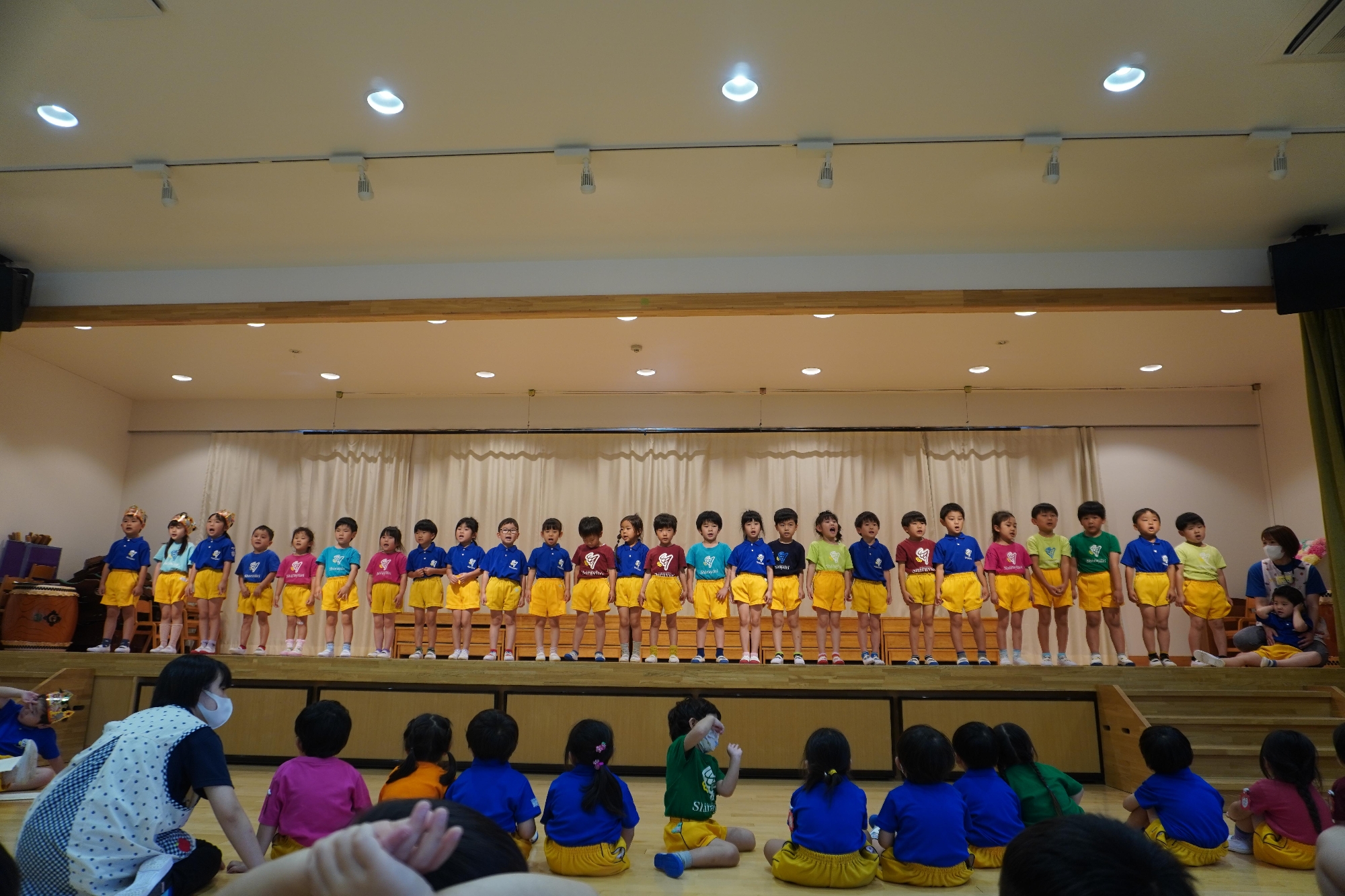 ほしぐみさんからなかよしランドさんまでホールに集まり、6月生まれさんのお誕生日をお祝いしました!