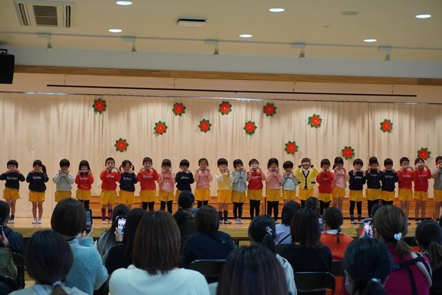 はじめに、各クラスごとにハーモニカの演奏・歌の発表をしました。