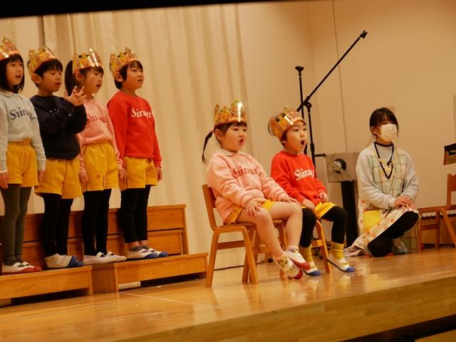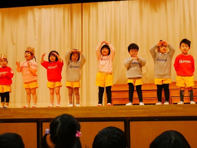 『♪コンコンクシュン』の歌を歌いました。舞台に上がり、元気に発表することができました。