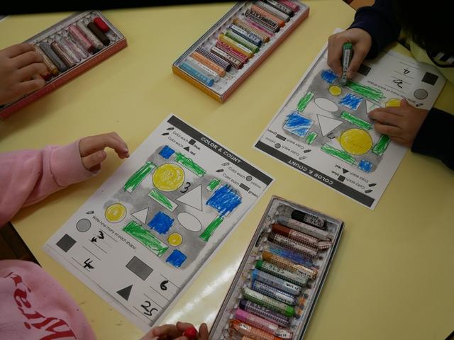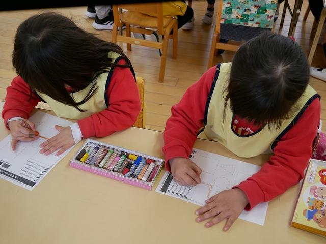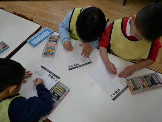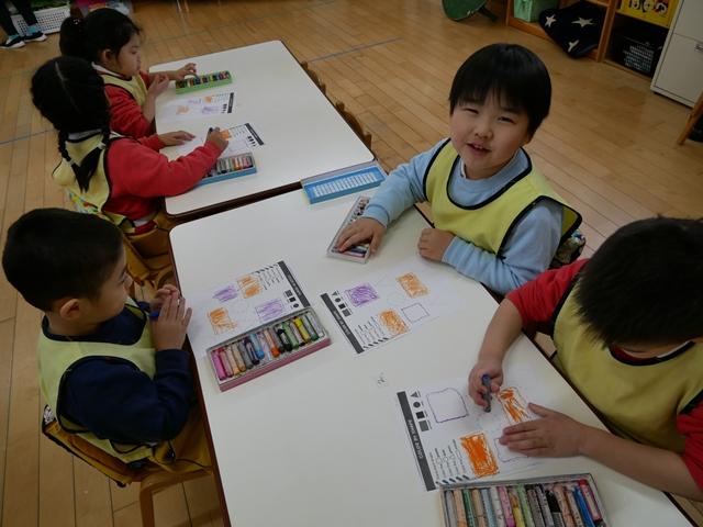 とんぼ組は、青は英語でなんて言うかな?と色に親しみ、〇や□を色塗りしました。