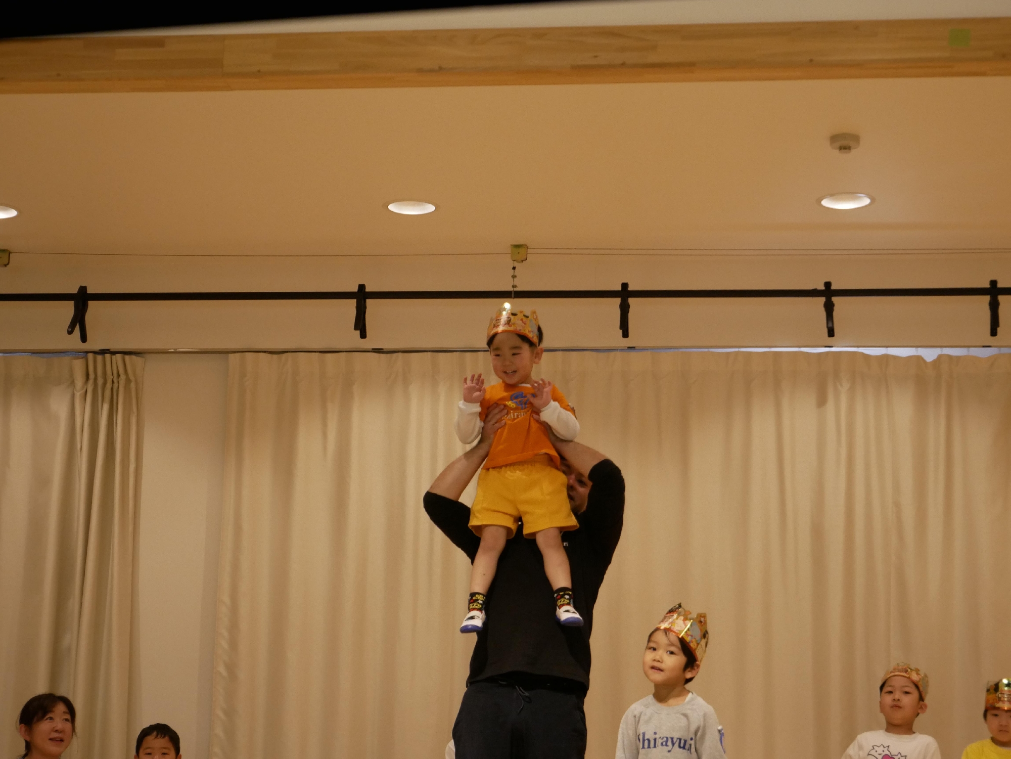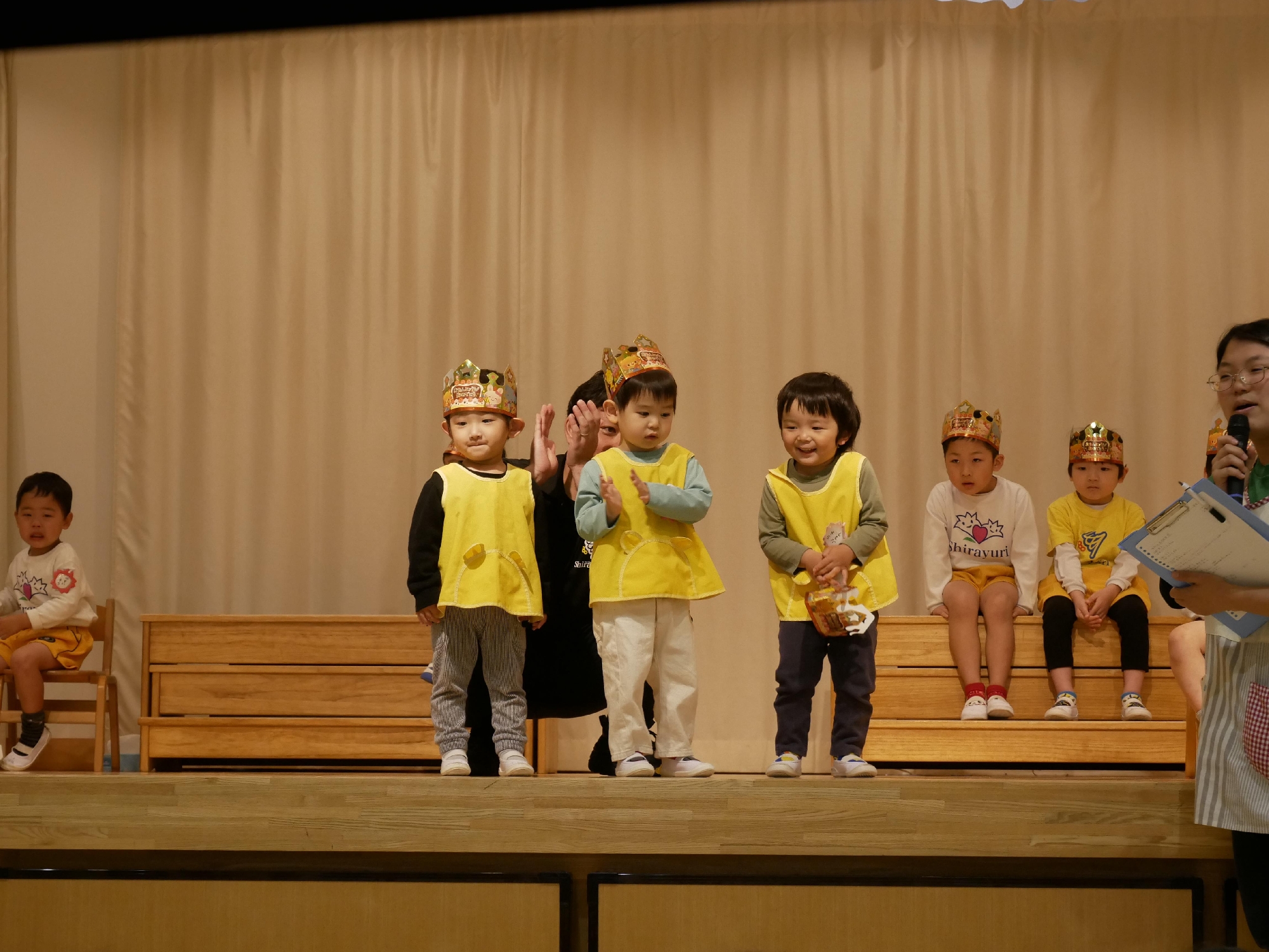 キラキラの冠をかぶったお友だちが舞台に上がりみんなでお祝いをしました。