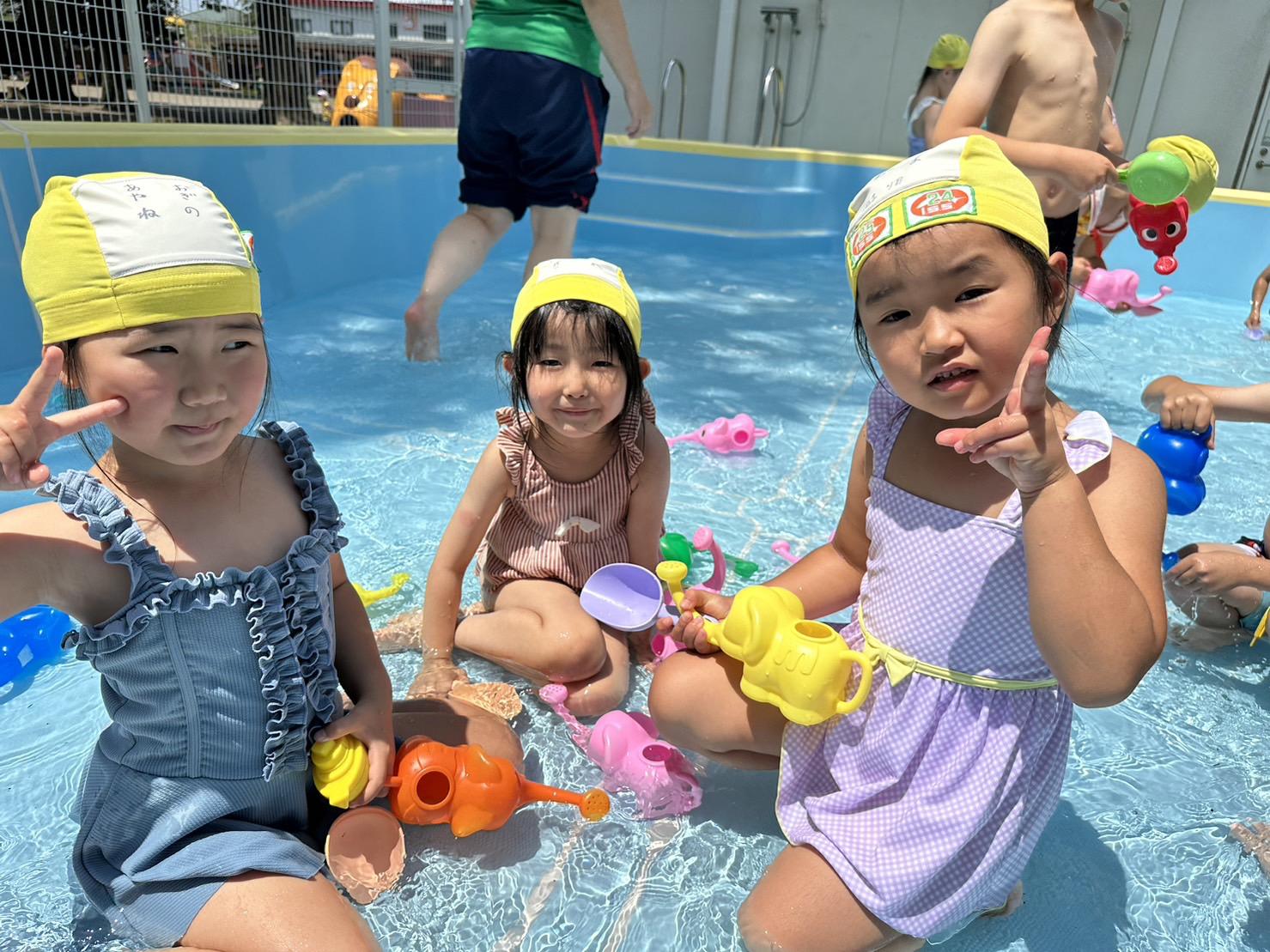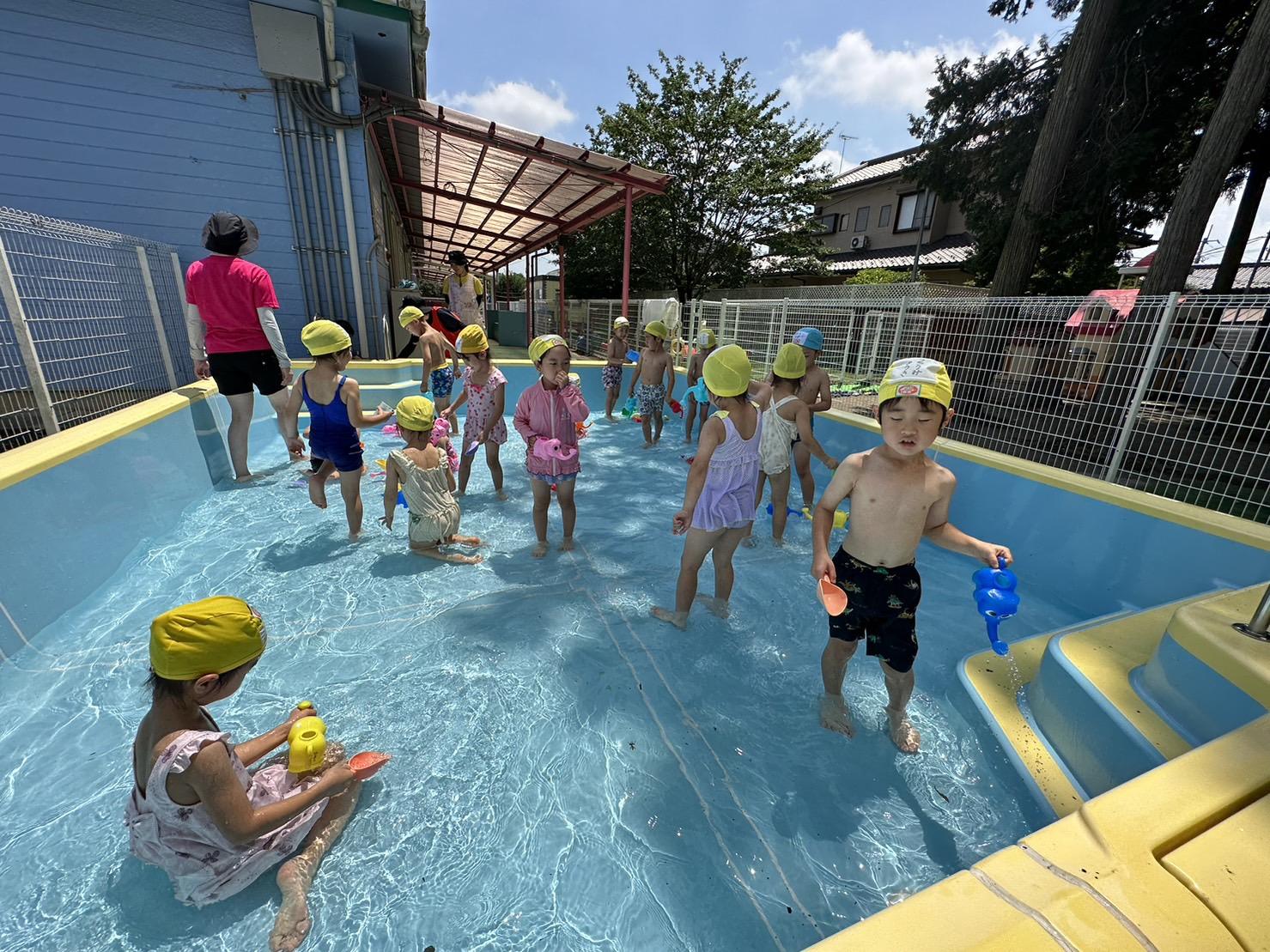 プール遊びの際は、担任の先生とプール見守り係の先生たちと複数の先生が一緒にプールに入り