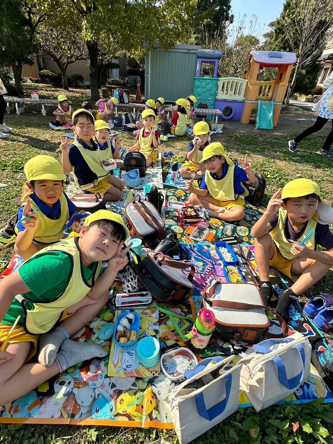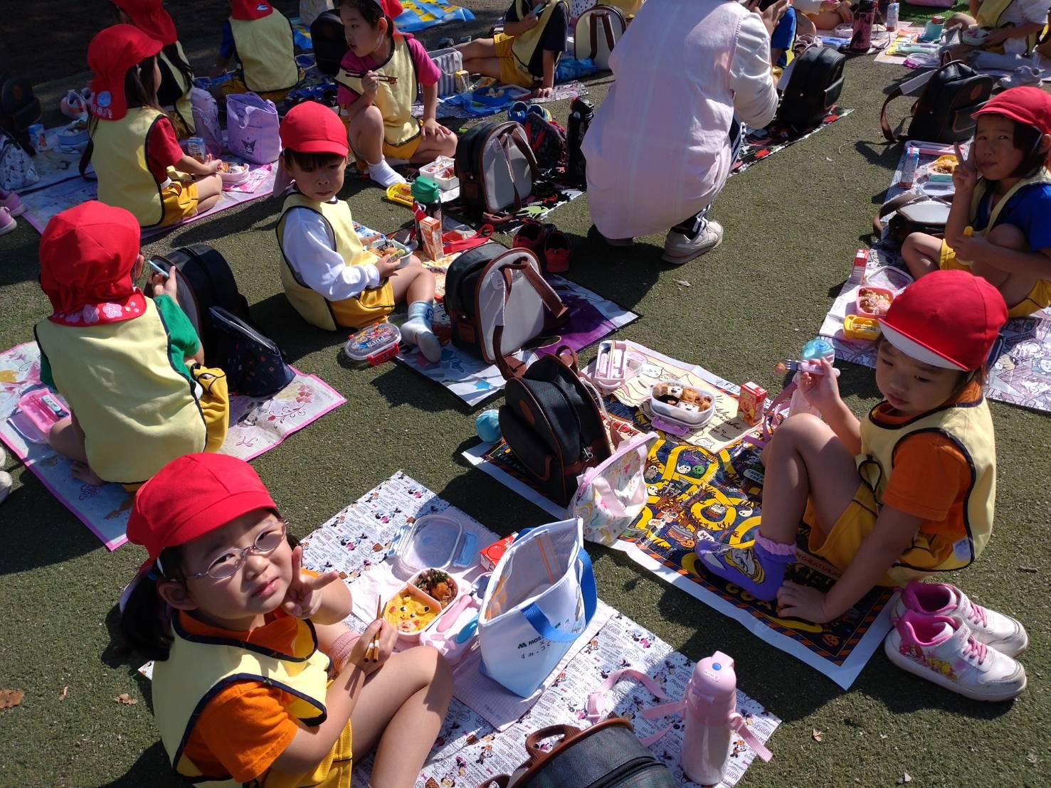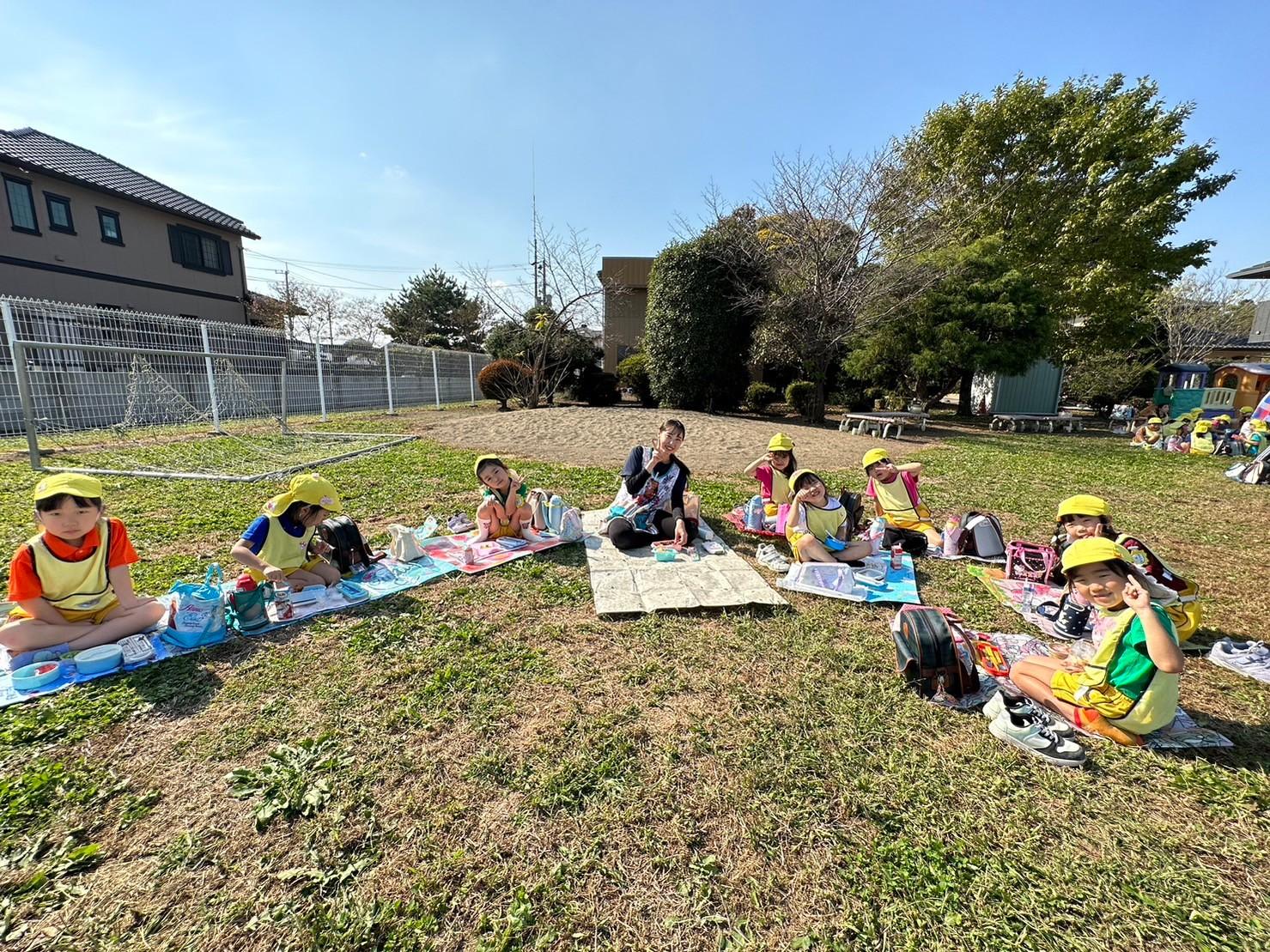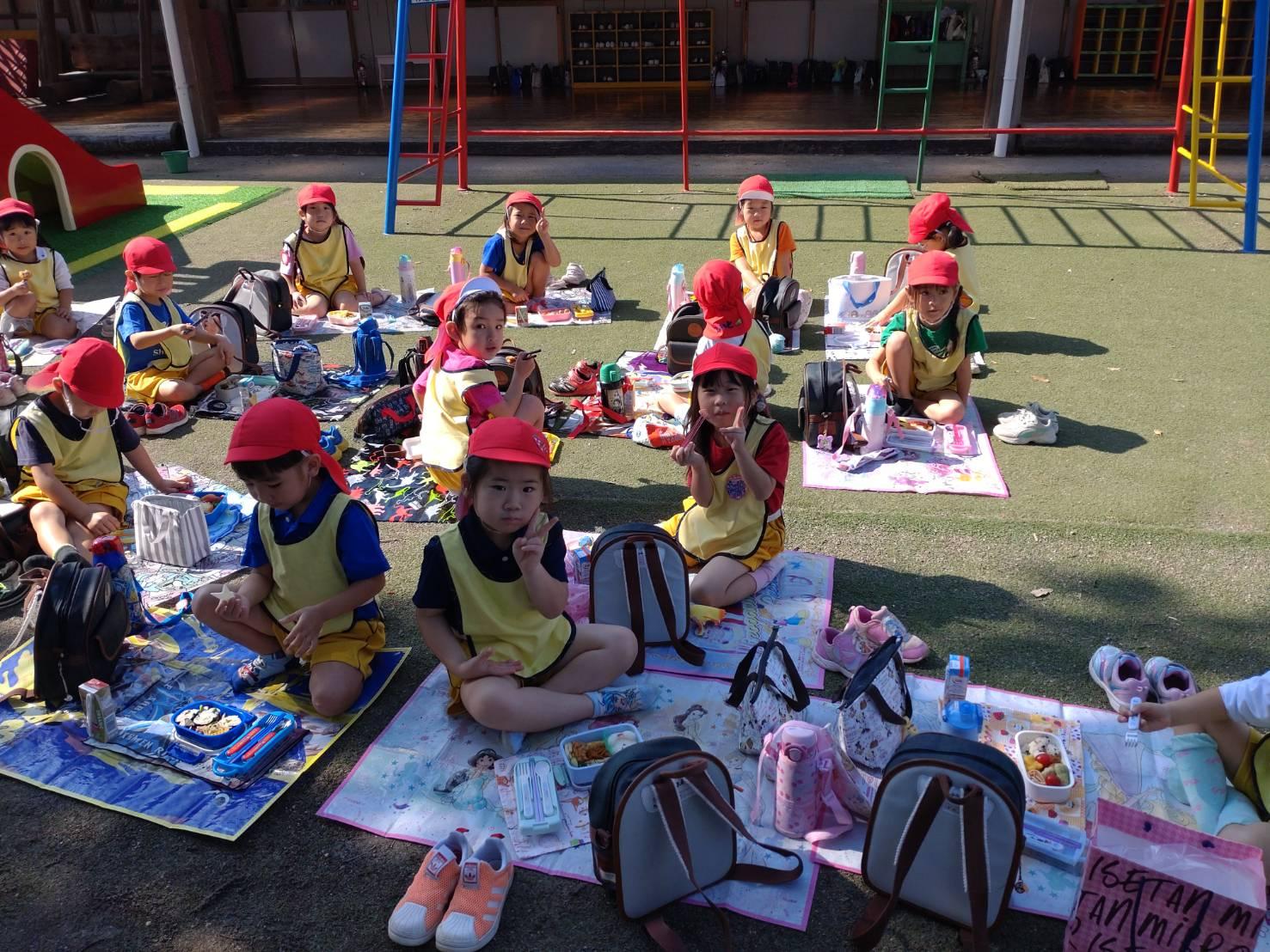とんぼ組・ほし組は園庭とはらっぱ広場で青空ピクニックお弁当をしました。
