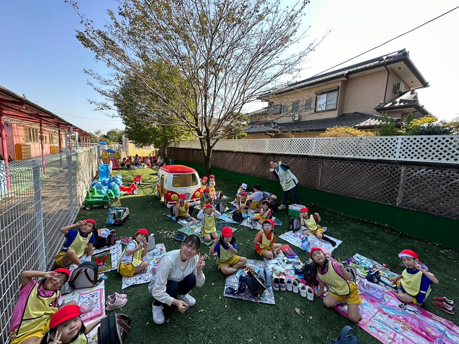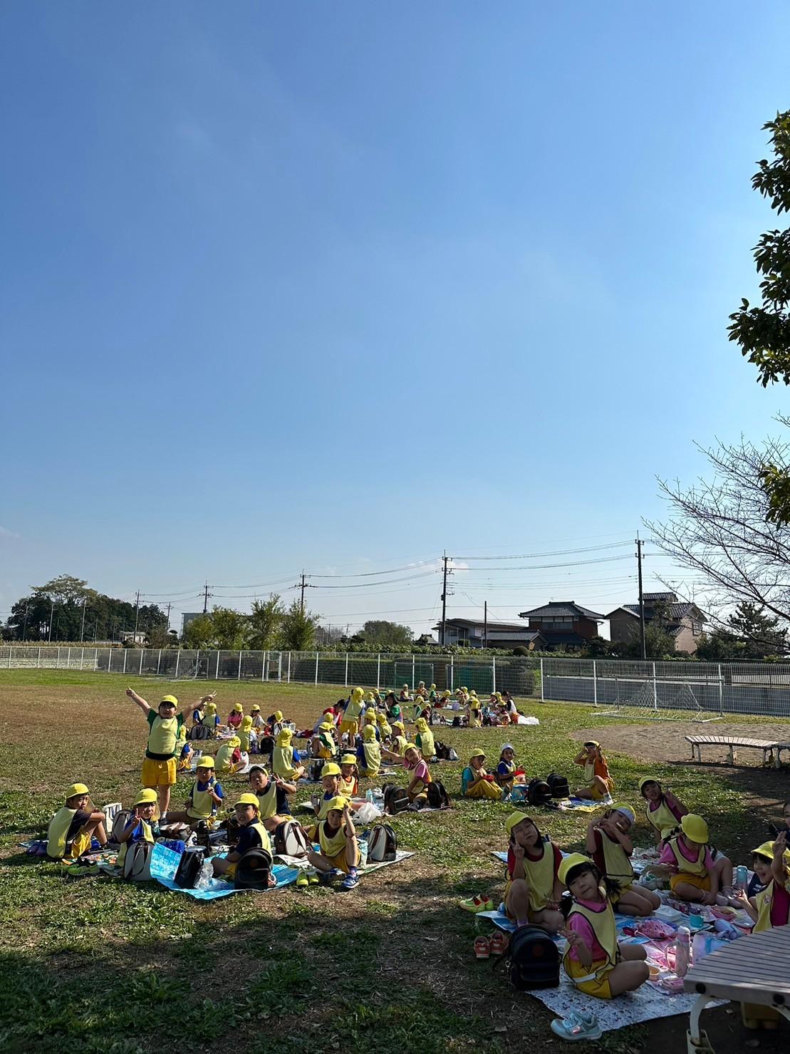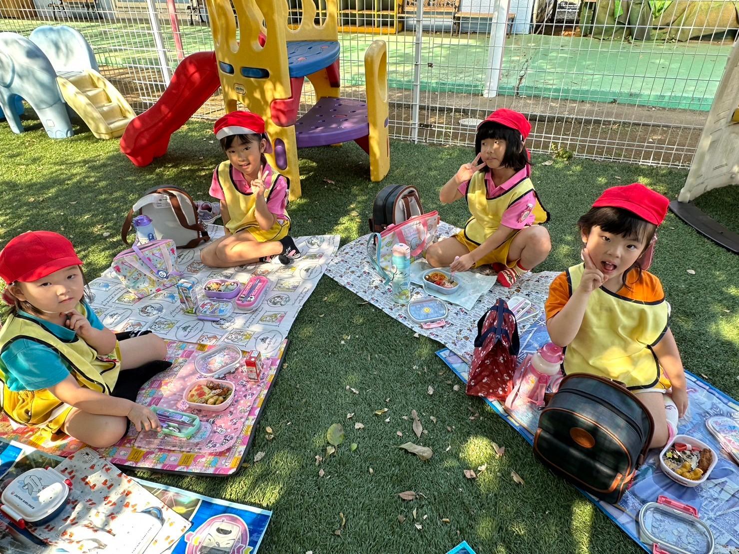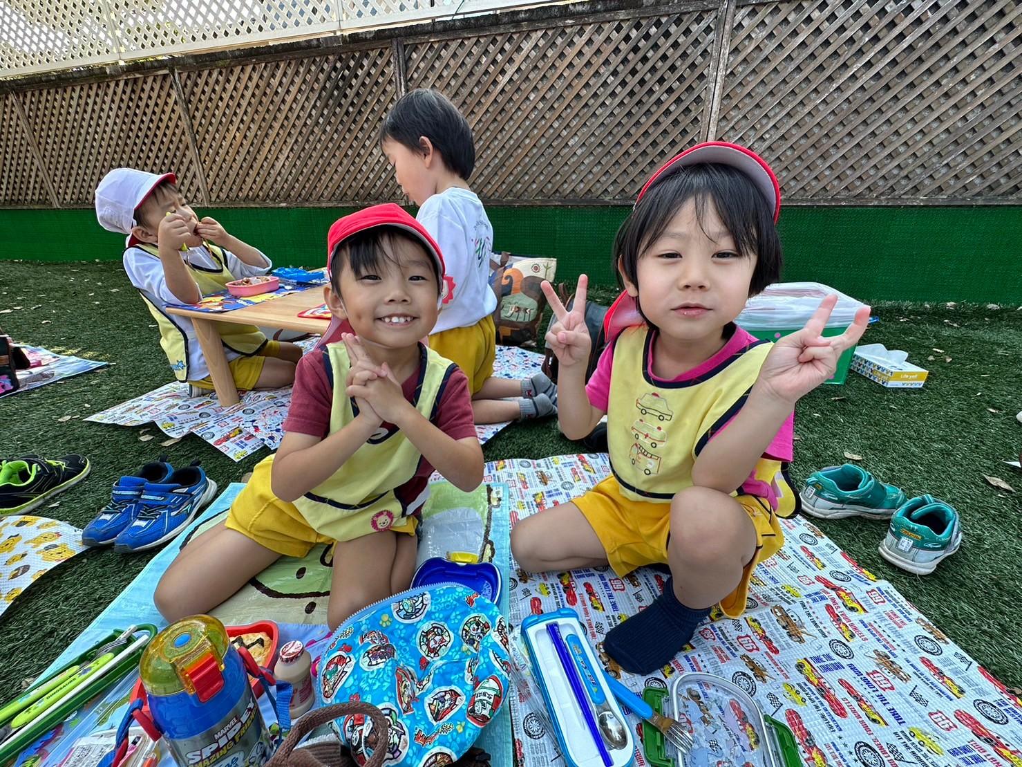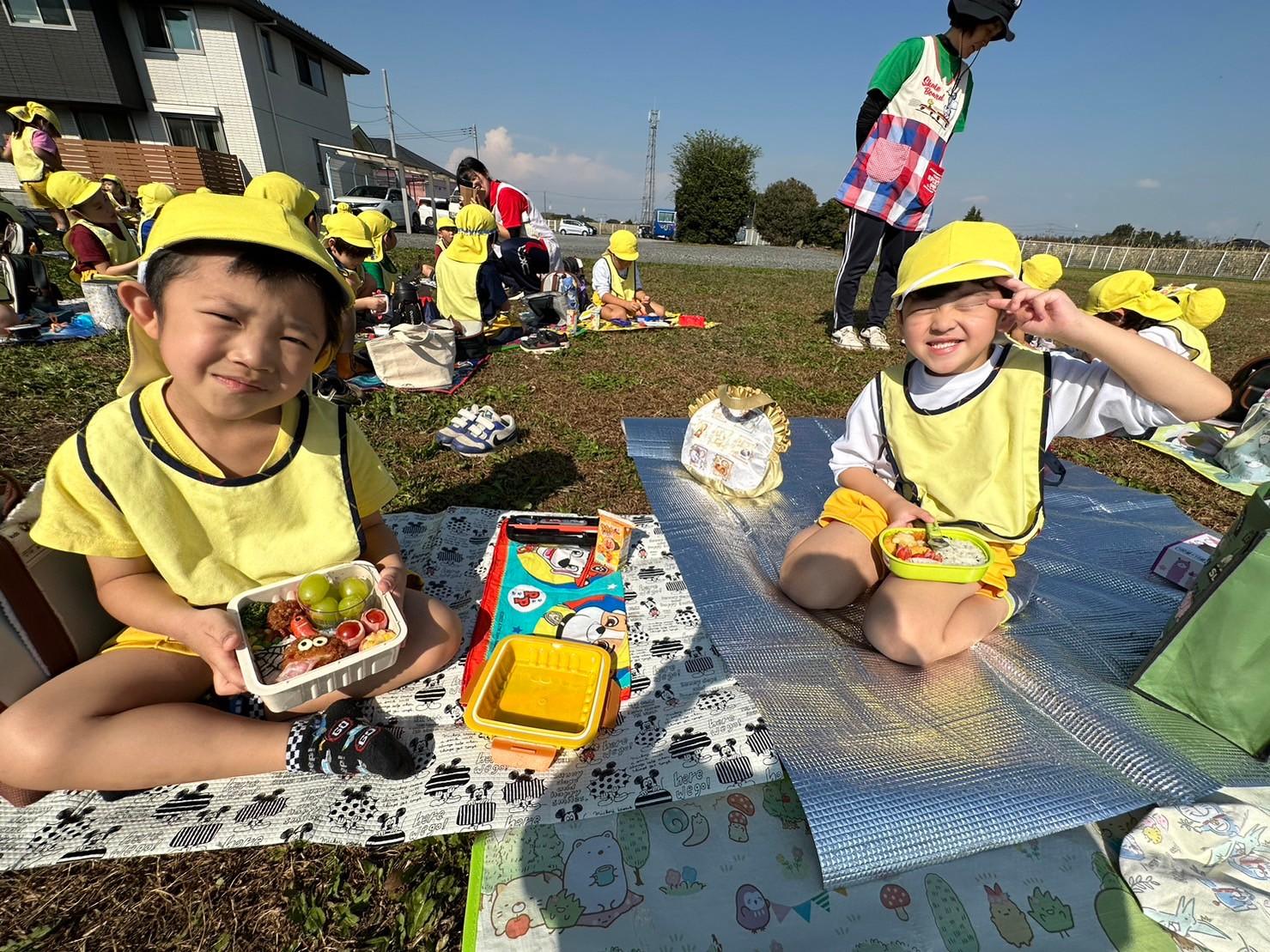 とんぼ組・ほし組は園庭とはらっぱ広場で青空ピクニックお弁当をしました。