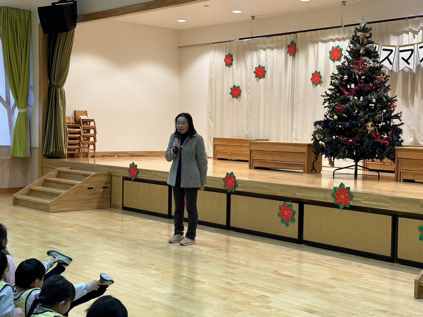 終業式では、各クラス代表のお友だちに冬休み楽しみにしていることを発表してもらいました。