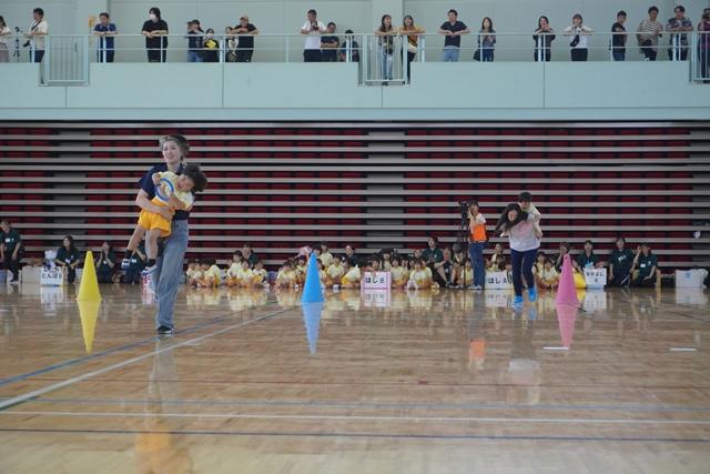 親子競技「ぽいぽい玉入れリレー」では、玉入れの玉をバトンに6チームの真剣勝負。