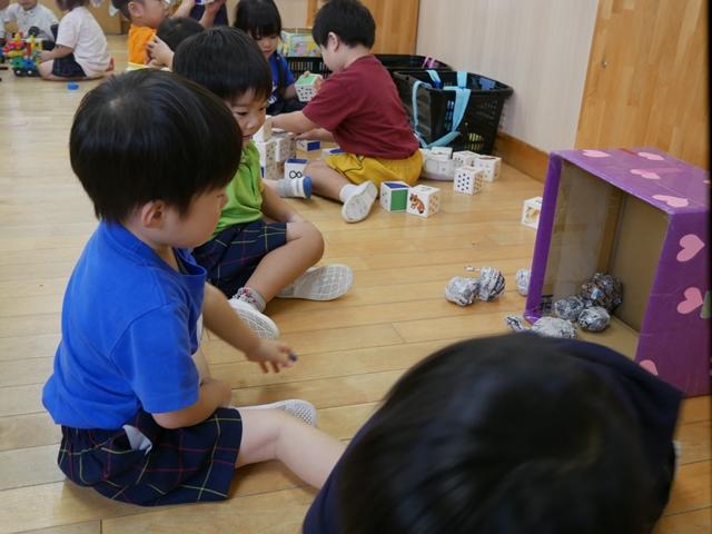 午後は、お部屋で新聞紙ボール入れ、ブロックなどで遊びました。